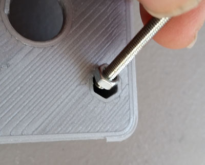 Next insert the 4 nuts by putting them on a long screw and inserting them as shown.