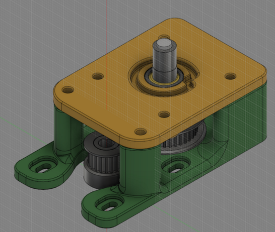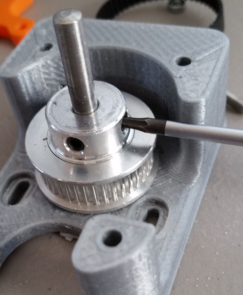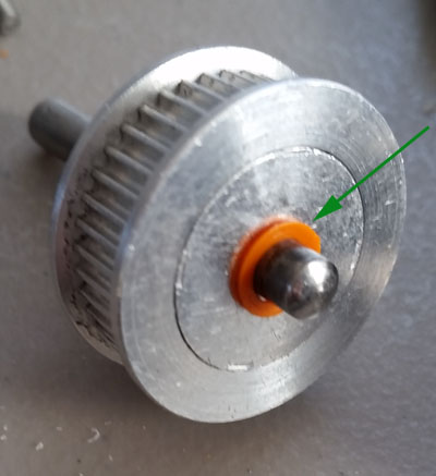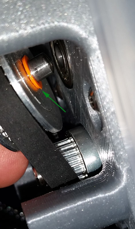 Make sure that the orange ring (green arrow below) is on the shaft as shown - take the pulley and shaft and put the belt around it then also put the belt around the 20T pulley and secure the belt first and then start to insert the shaft into the bearing (just as shown in photo). Remember that the base (gray plastic in photo) should be able to slide up and downto reach.