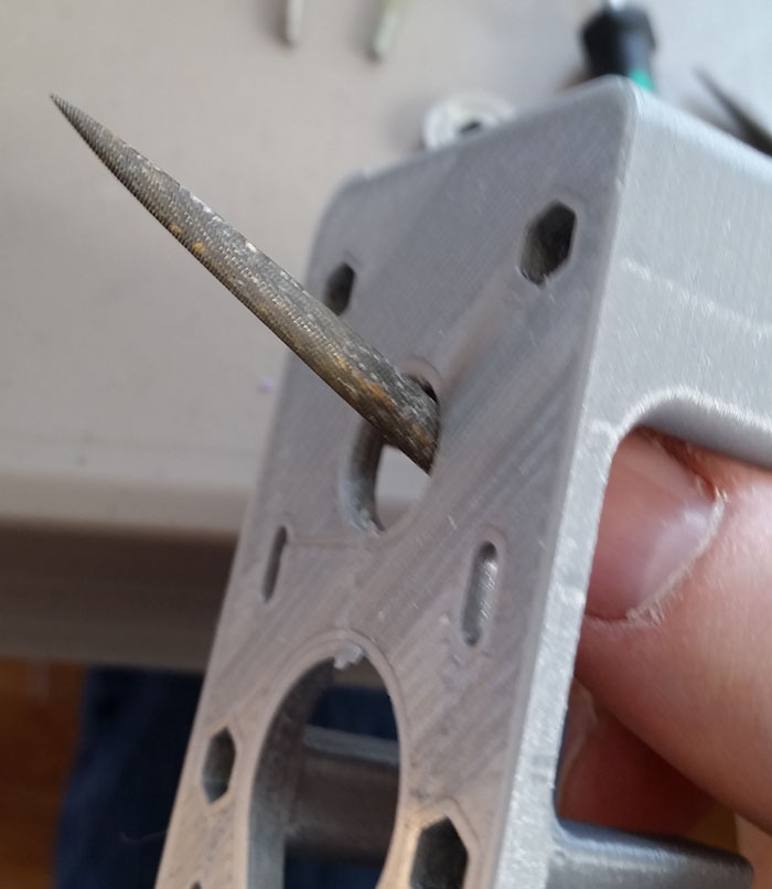 File the hole larger so that it fits a bearing.