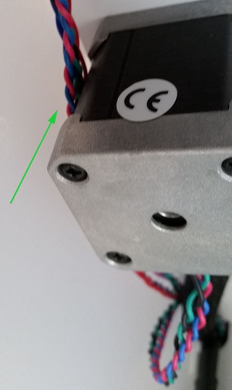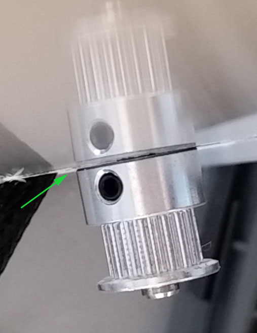 Now remove the old feeder saving the hardware - you will need the 4 washers and 2 of the 4 screws (25mm long). Have the feeder motor rest on the glass bed. Remove the old sleeve and save that. Put the 20T pulley on the motor shaft as shown. Stick the motor back through the wall and you want to tighten the pulley so there is almost no gap as shown with green arrow below. When measuring consider using a piece of thin carboard such as a business card - this is about the right distance. Also make sure the wires (green arrow) aren't in the way of the stepper when mounting it. In other words make sure the motor is flush. Tighten the 20T pulley with both set screws very very tight.