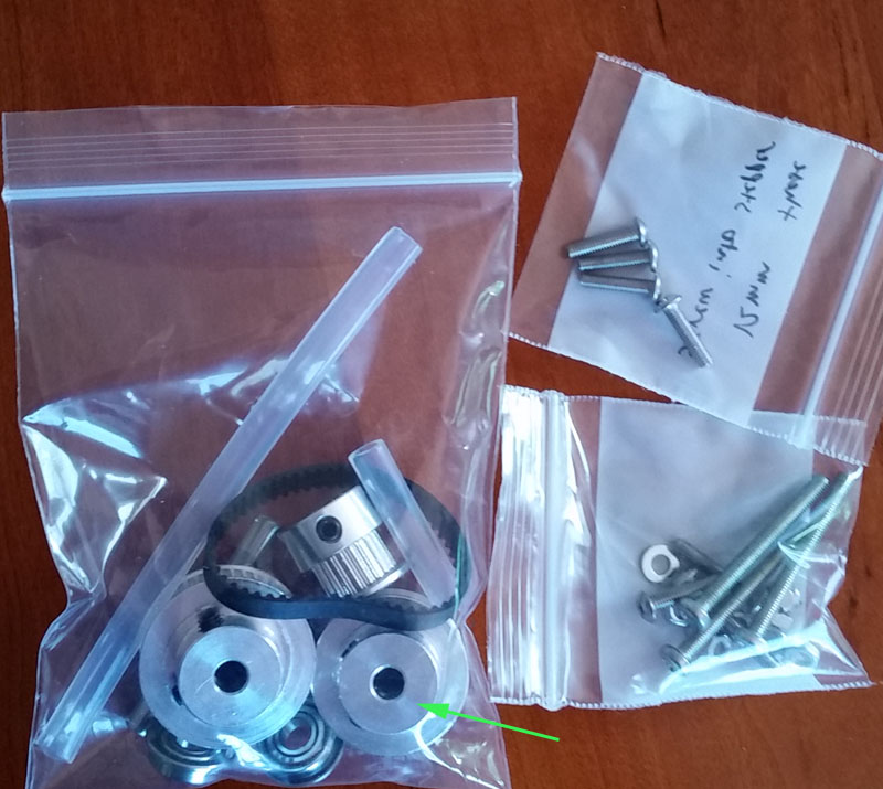 The parts that come in my kit from gr5.org/store - note that the green arrowed part is a 36 tooth pulley if you want 1.8X ratio. Not normally included and not recommended. Contact the store if you want a 36T at cost. The kit is currently $25.