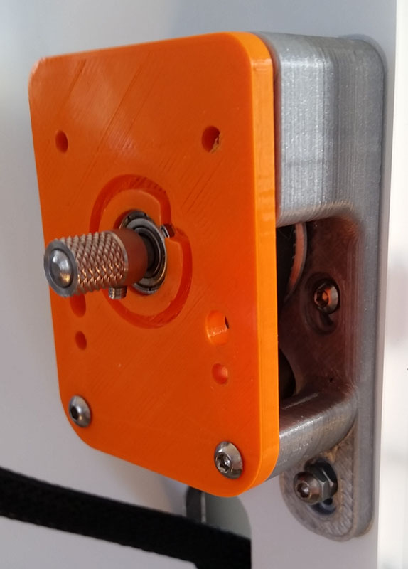 Once inserted hold it in place and put the plate over the shaft as shown below. Put the lower 2 plate screws (15mm) to hold it all together. Slide up the entire assembly to tighten the belt and tighten the 4 screws that are in slots and that hold the stepper motor. Check that the belt is tight and turn the belt with your fingers. Note that the plate will flex away from the base at the top area for now - this is expected (as shown in photo) and will be pushed against the base when we add the feeder. Put the knurled sleeve over the shaft. End should be flush with the end of the shaft as shown in photo below.